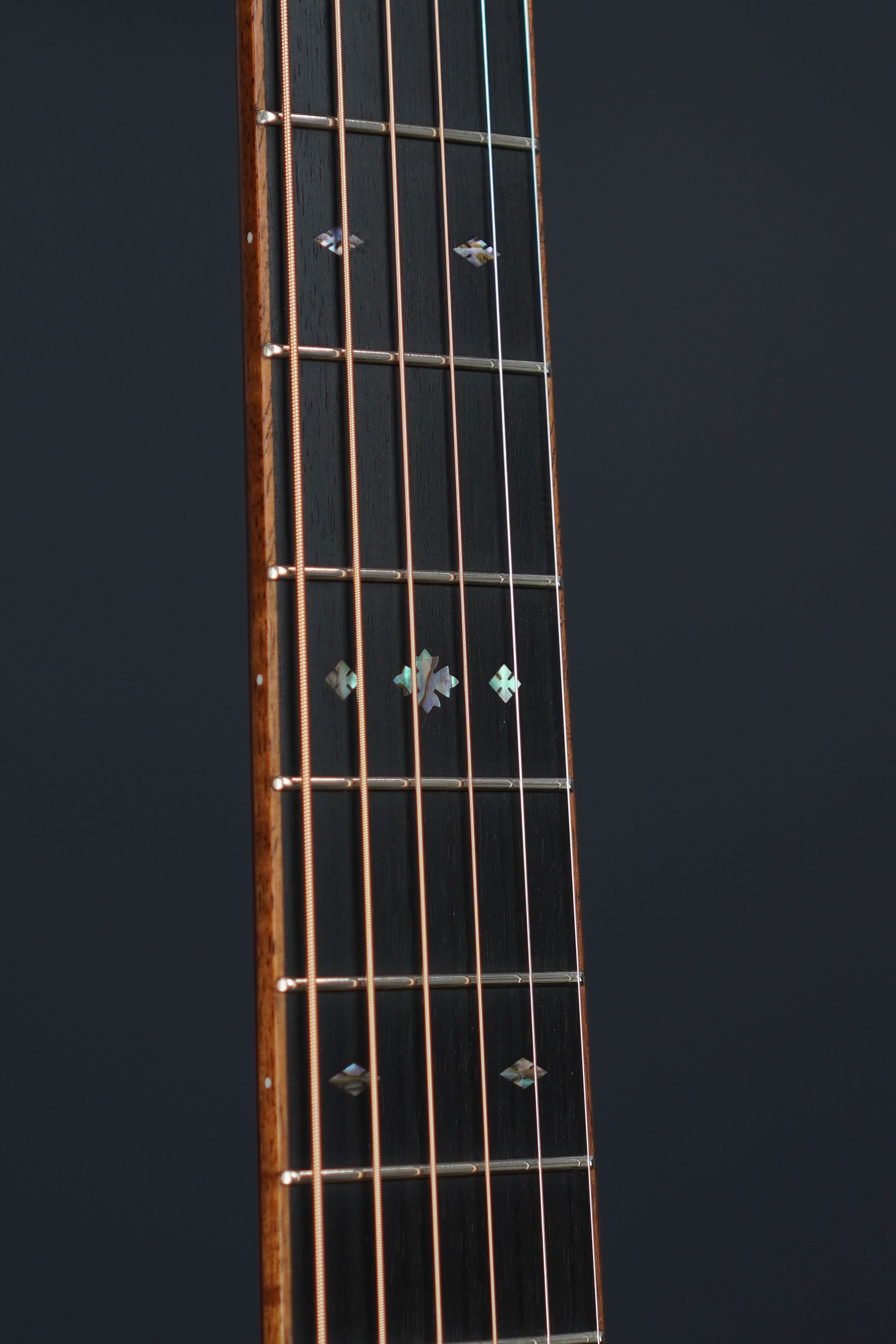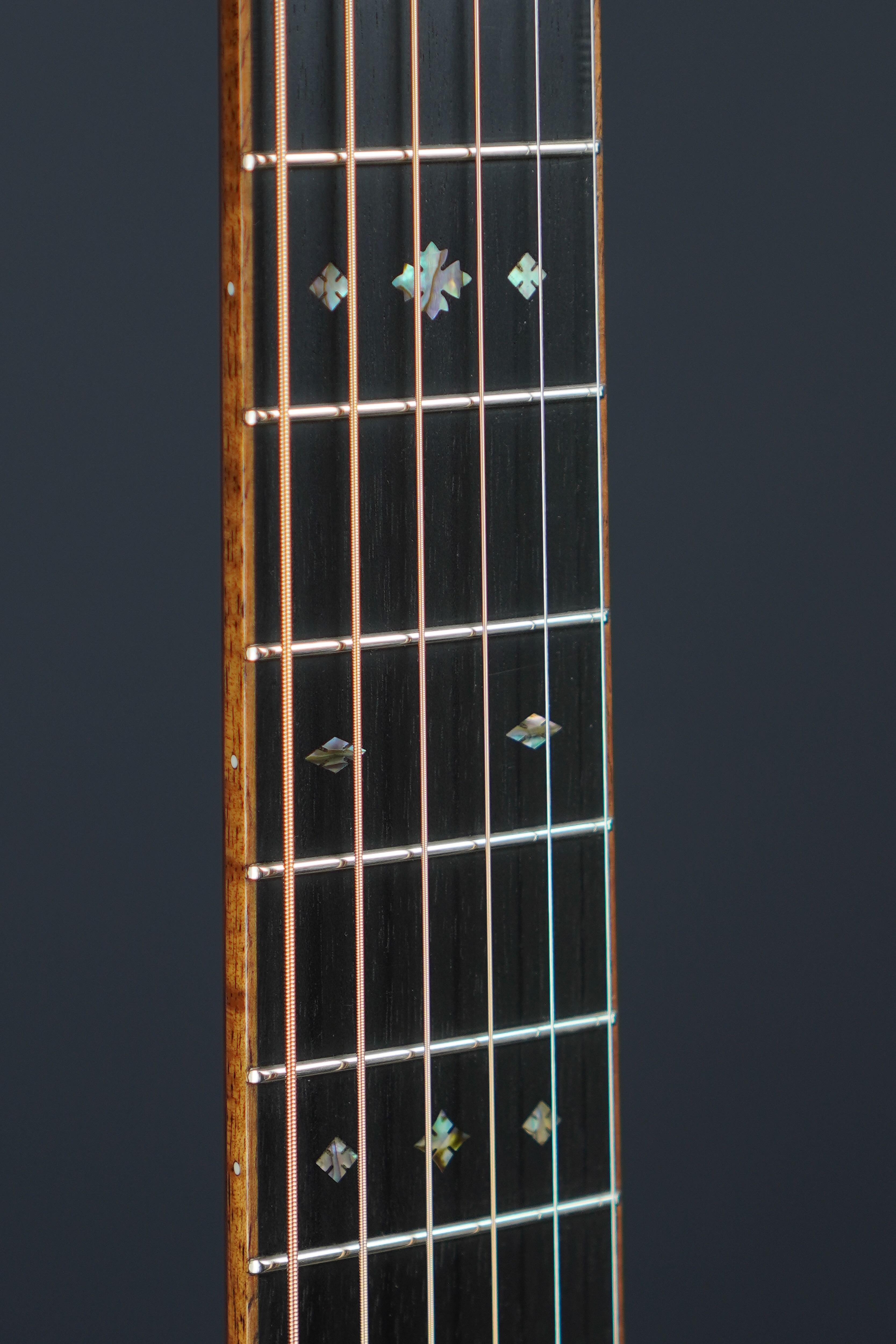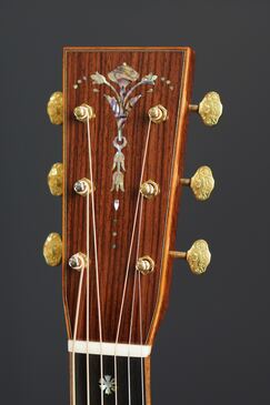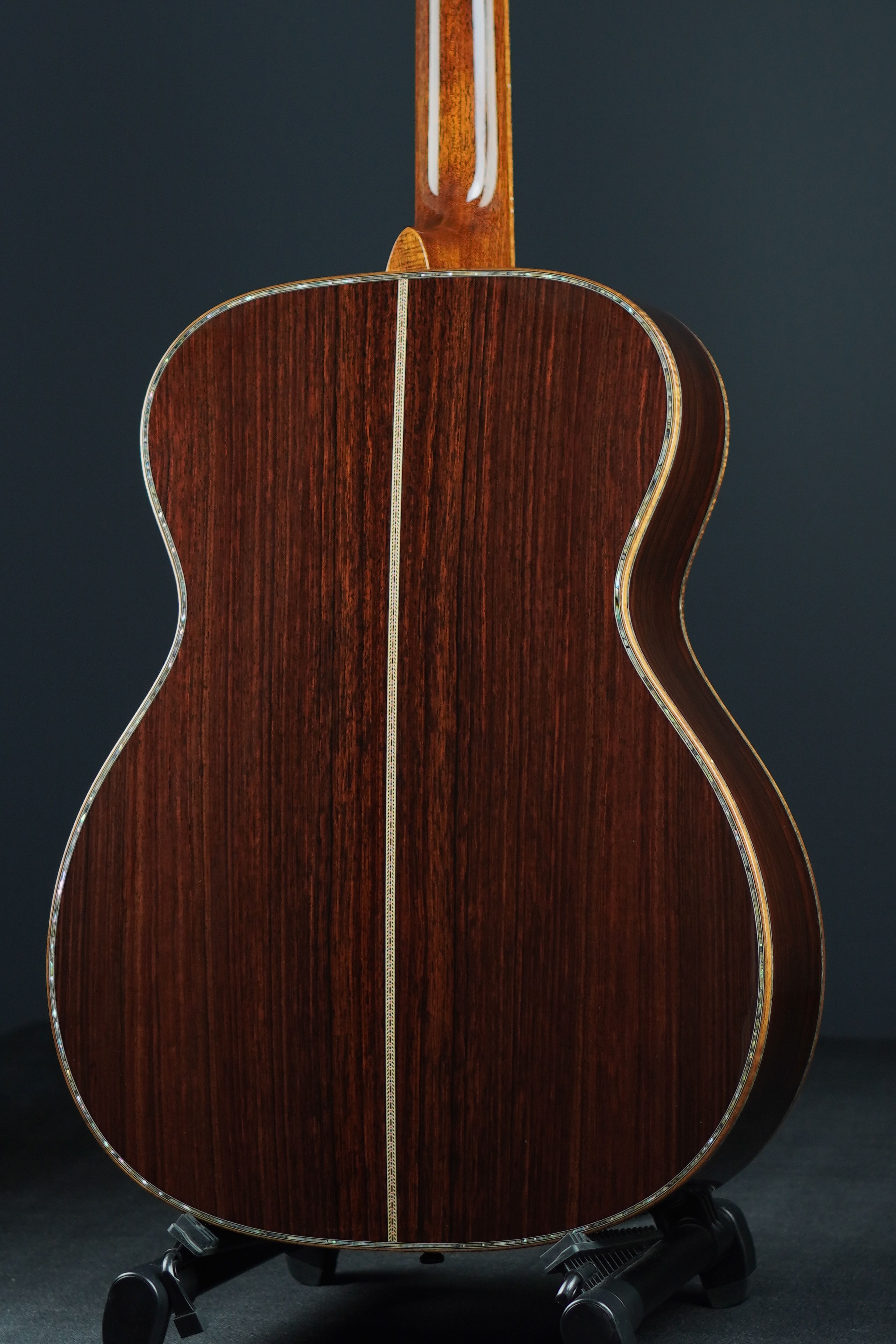 サイド&バックのイーストインディアンローズウッドも、赤黒く陰影の深い木肌が印象的で、木目の流れも程よく暴れながらも絶妙に通りの良い、眺めるだけでもため息が出そうなプレミアムグレードの良材がセレクトされており、そこにはトップと同様にバインディングにはフレイム杢のコア材が用いられ、45グレードらしくアヴァロンのトリムとカラフルな寄せ木細工のバックストリップという美しくもウッディな風合いの仕上がりです。