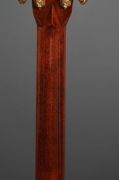 1930年代の雰囲気を持つロングサドル仕様のエボニーブリッジには、このモデルのオリジナルではドット無しの黒いブリッジピンが採用されておりましたが、前オーナーがMartinのアヴァロンドットの黒いブリッジピンに交換しており、恐らくこのスタイルですので、このアヴァロンドットの方が似合うかと思いますが、オリジナルも残っておりますので、ドット無しの黒いブリッジピンに戻す事も可能です。