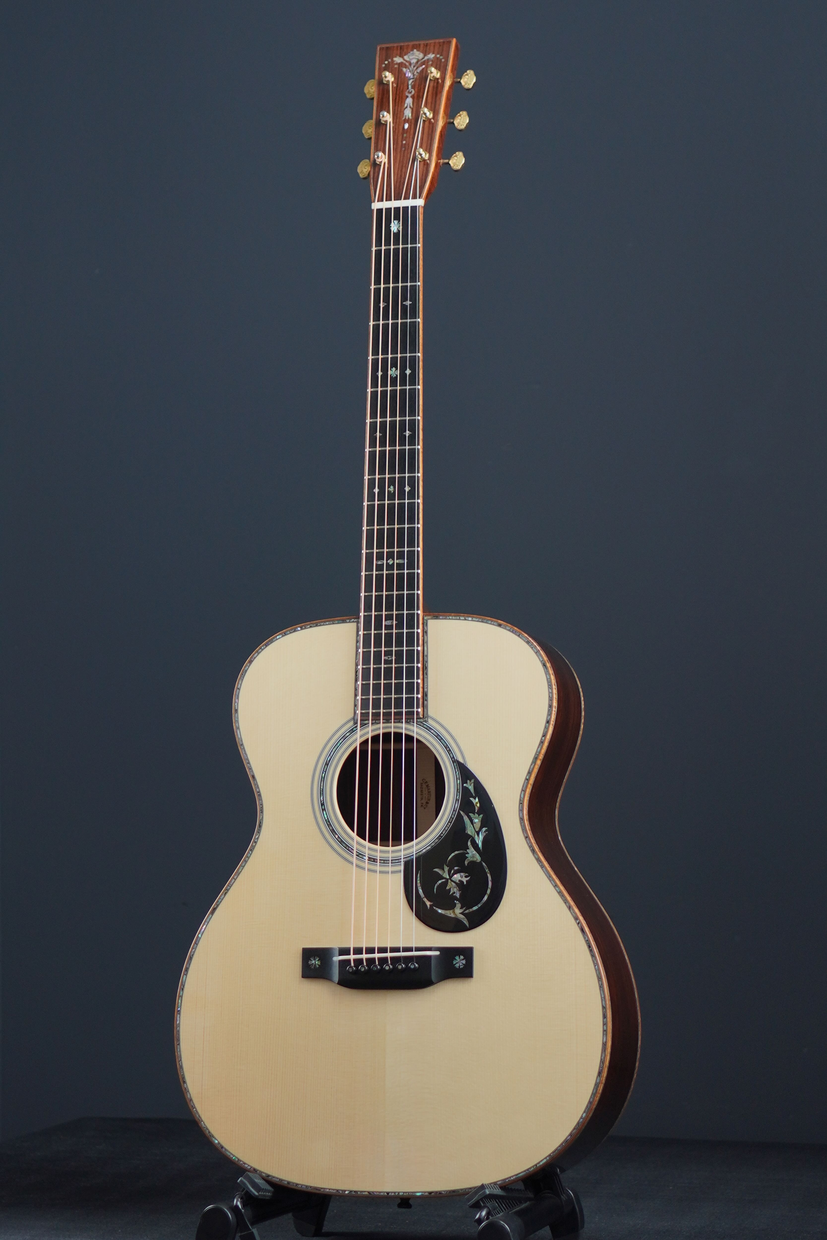 OM-45 Deluxeの特徴的なフローラルインレイのピックガードやヘッドのトーチインレイ、フィンガーボードには45スタイルのスノーフレイクにブリッジにも同じくスノーフレイクインレイと、艶やかなインレイワークはそのままに、ボディやネック、ヘッドのバインディングには美しいフレイム杢のコア材を用い、チューナーにはMartinロゴが彫金されたゴールドのオープンバックを採用と、よりエレガントに美しく仕上げられたカスタムモデルです。