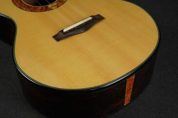 アディロンダックのトップとブラジリアンローズウッドのボディからは、しっかりとした剛性が感じられ、