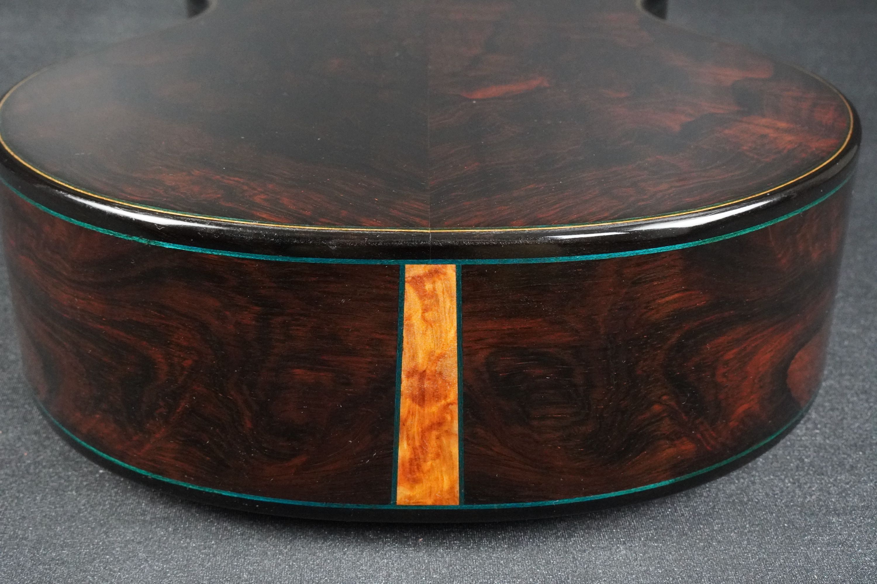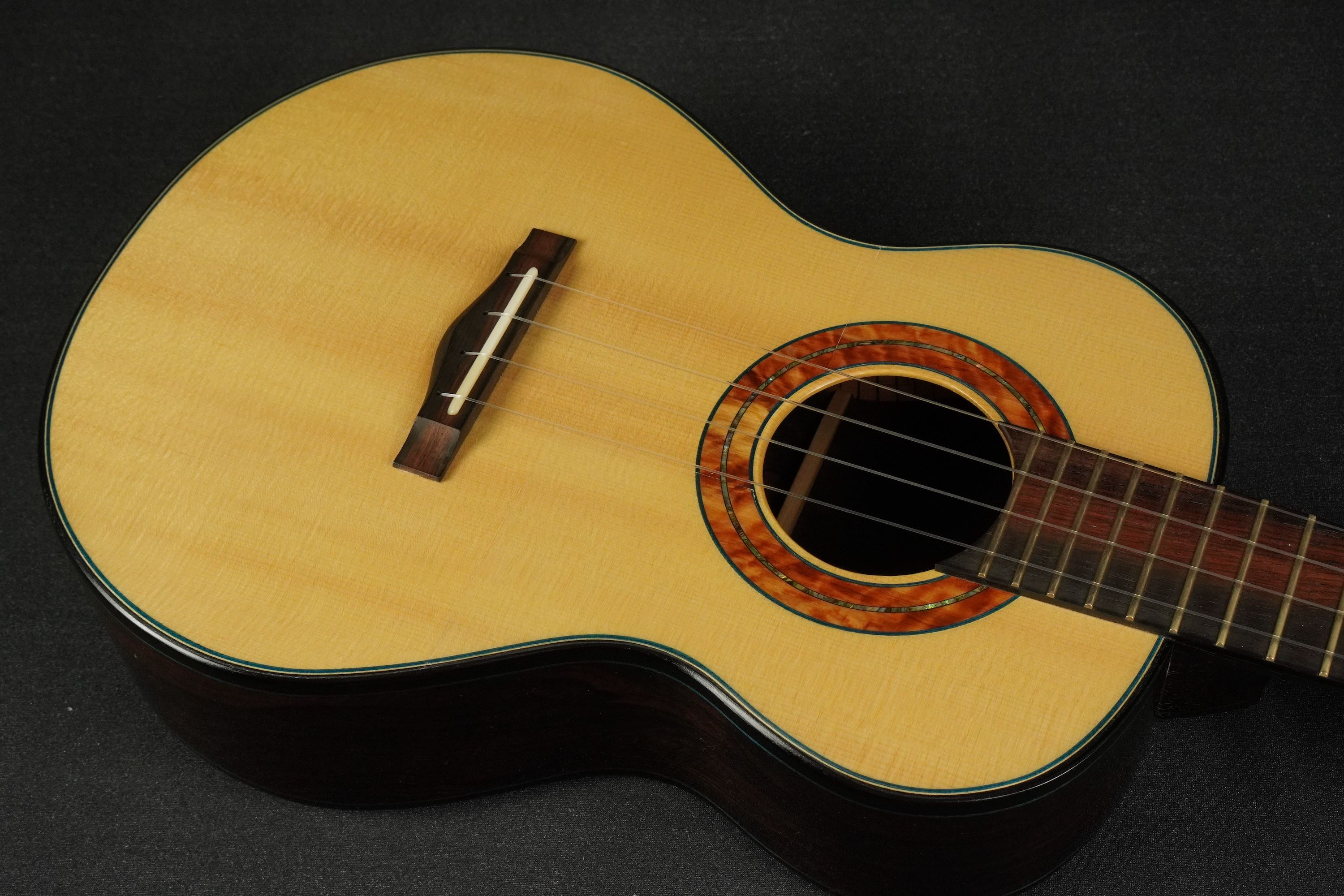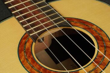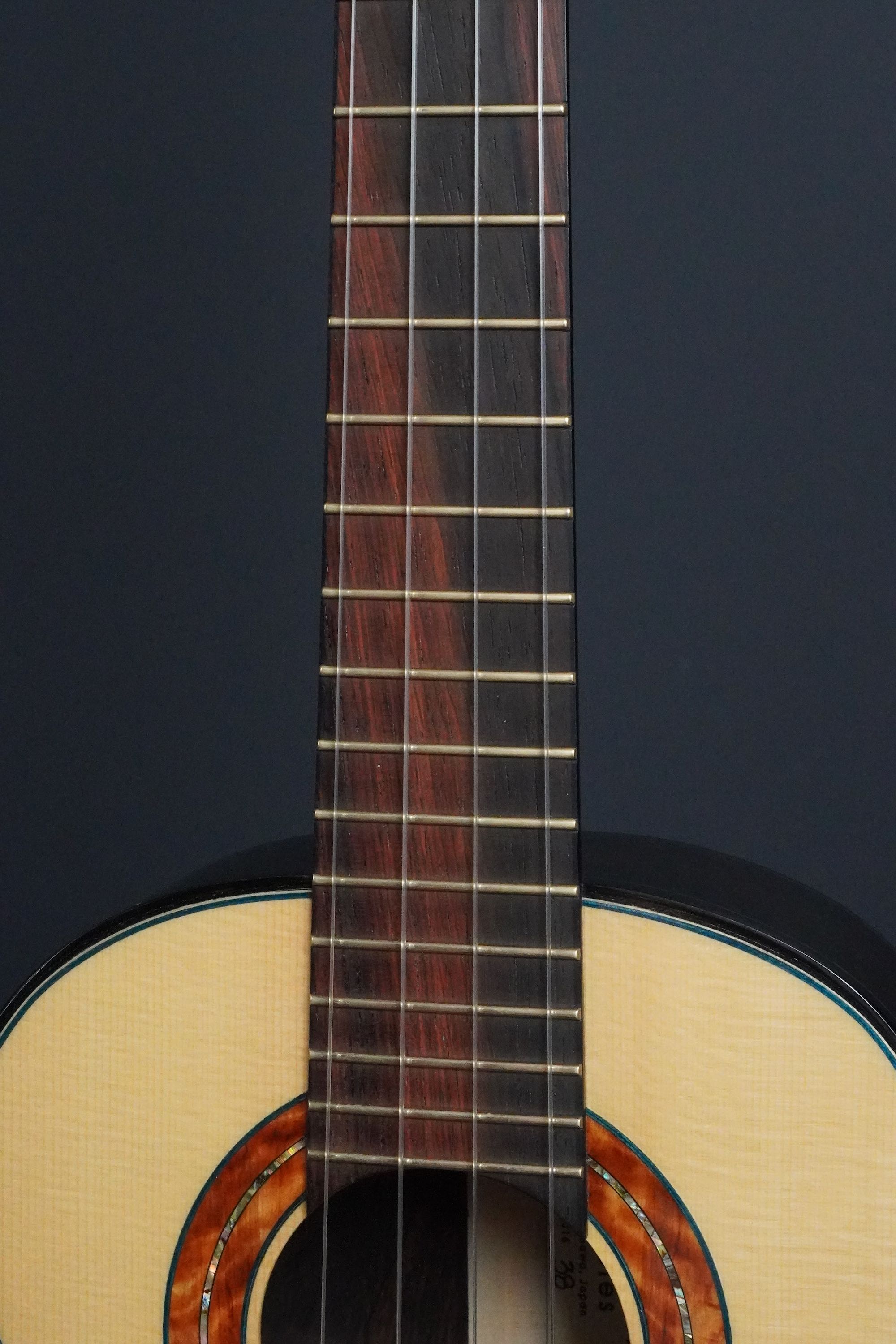 ウッドパーフリングがブルーカラー、黒いエボニーのバインディングとの組み合わせが渋く、キリッと引き締まったルックスになっております。