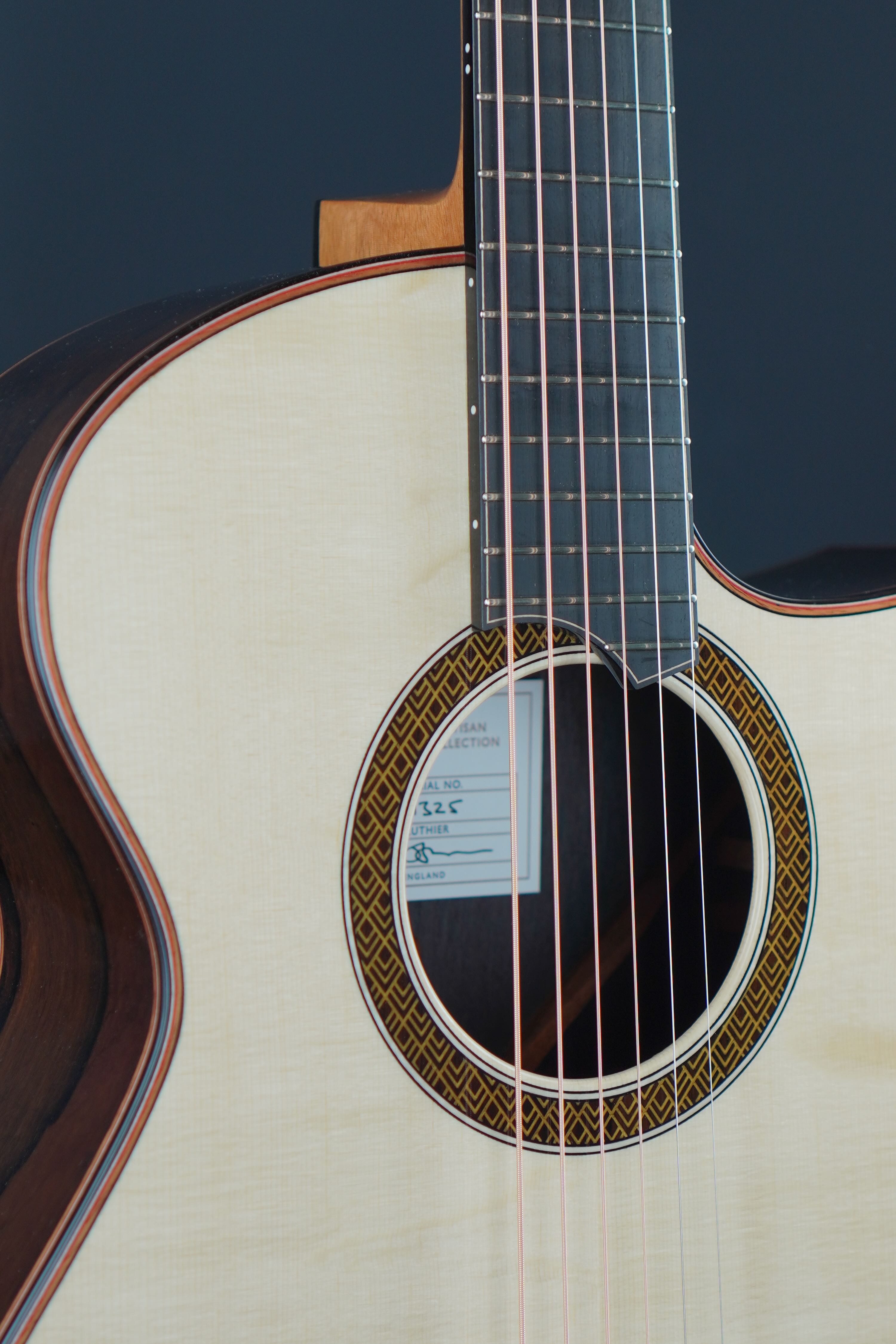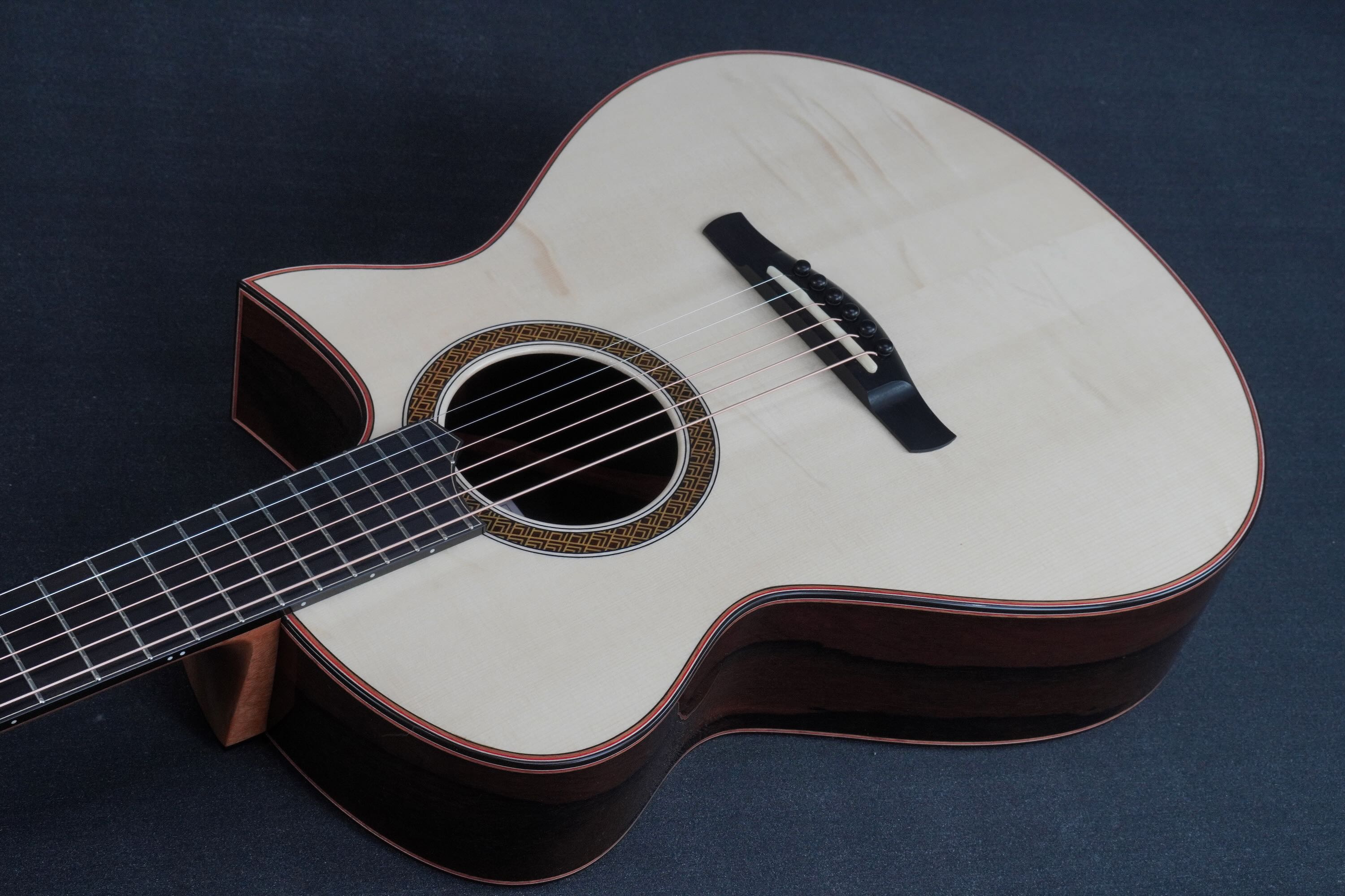 今回は、ボディ外周のパーフリング、ヘッドや指板、サイドバックの装飾に、紅を基調に、あたたかい色を随所に配置しています。