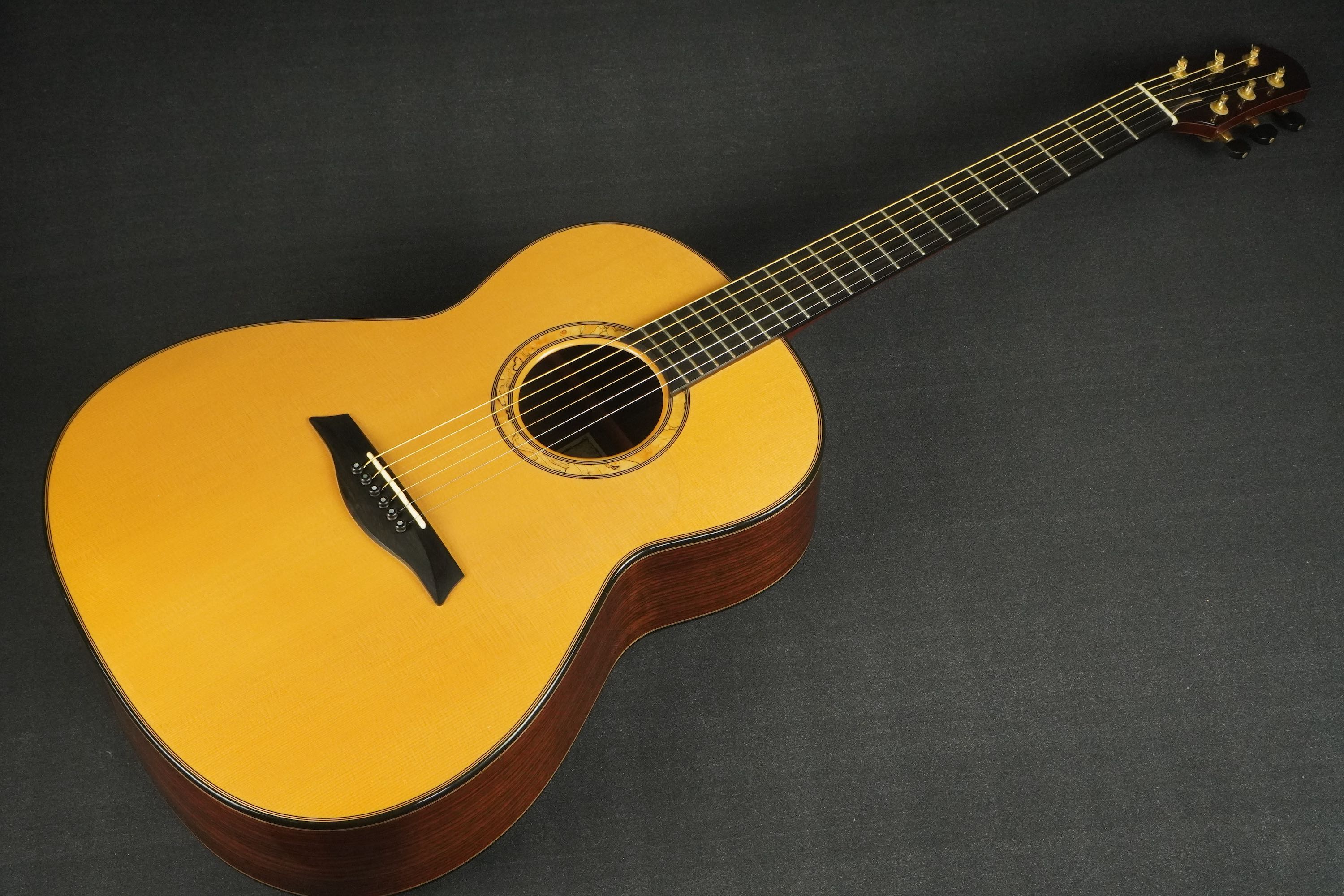 エボニーのボディバインディングには細かくウッドのトリムが入り、